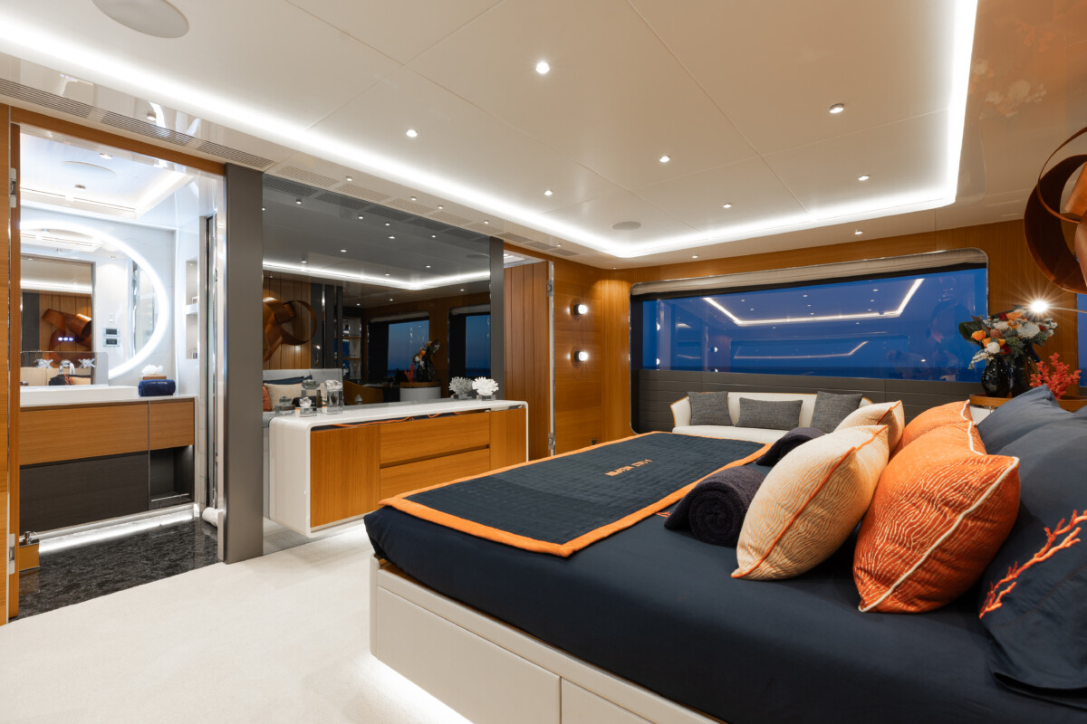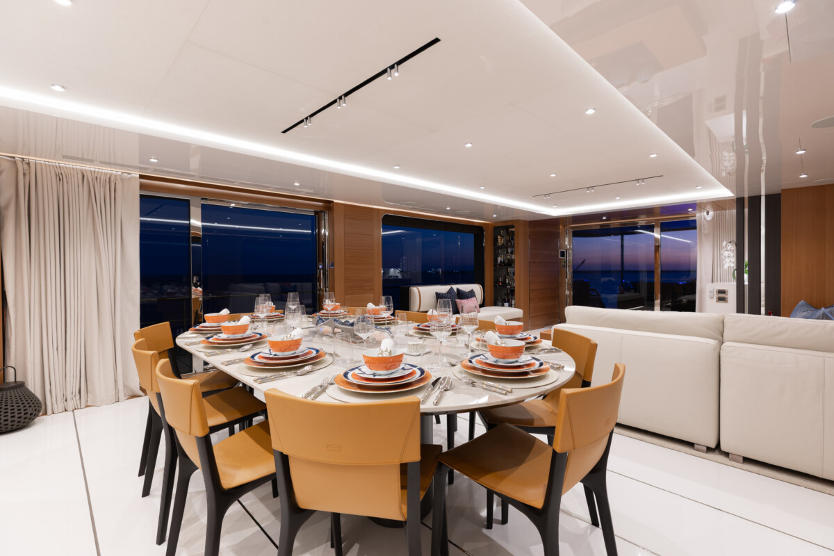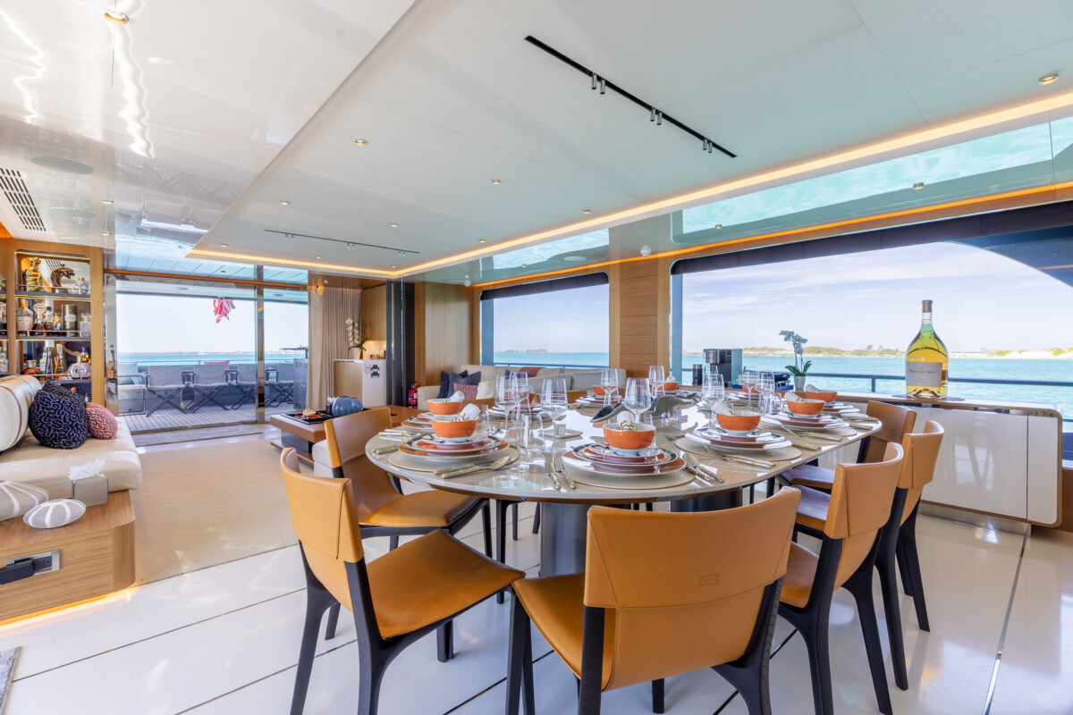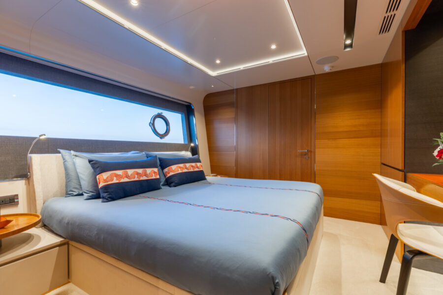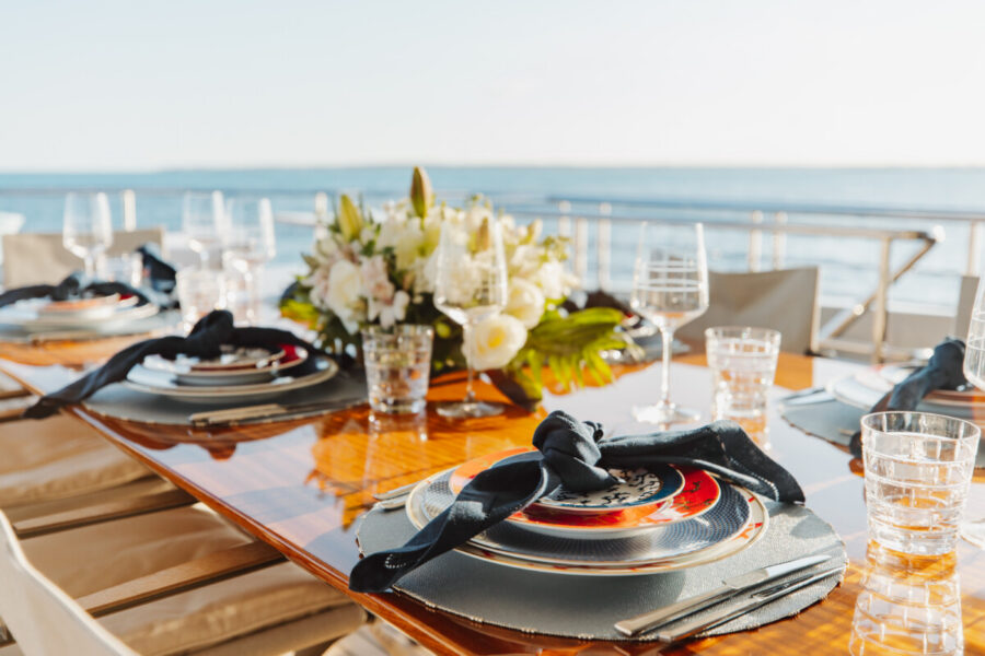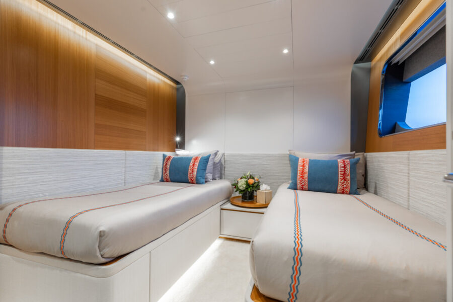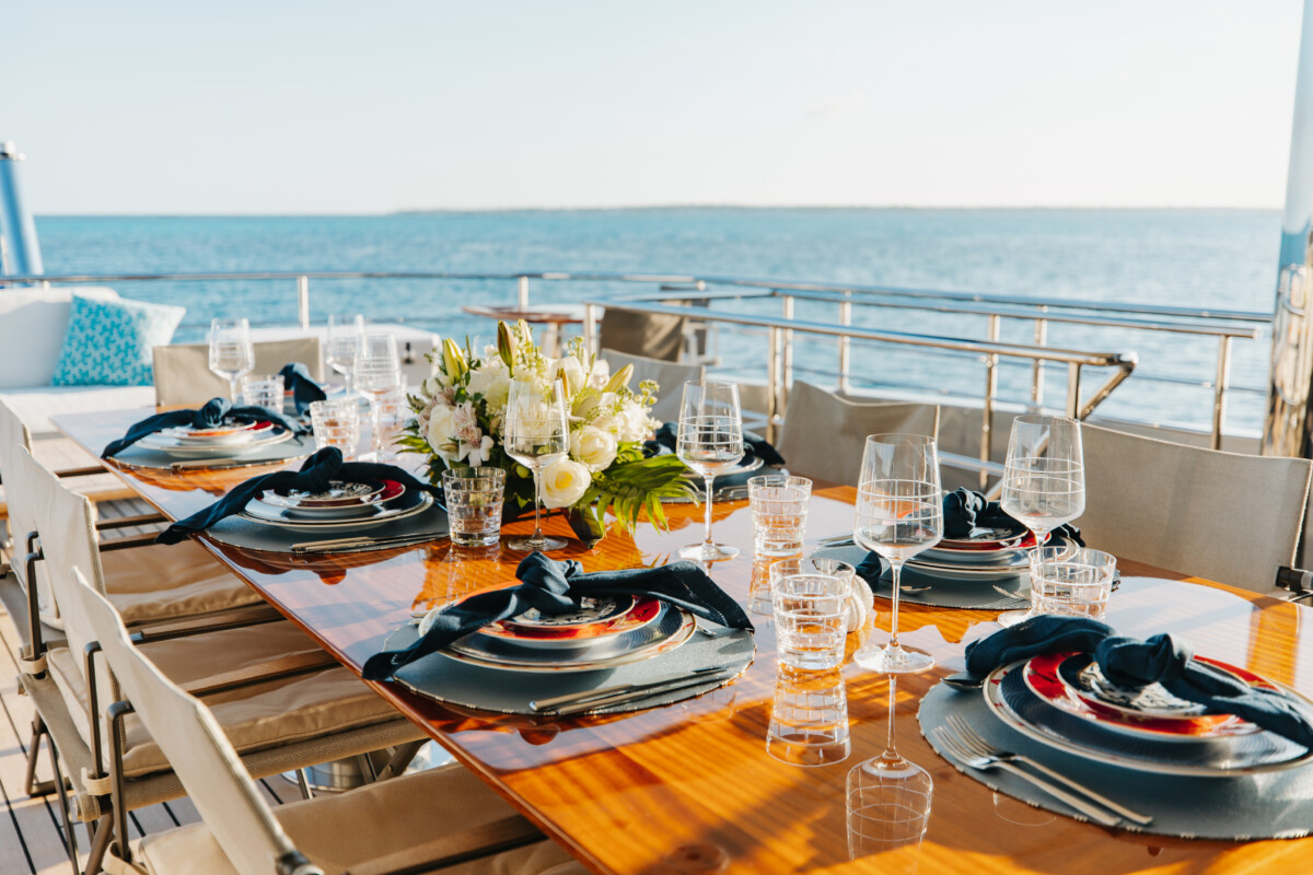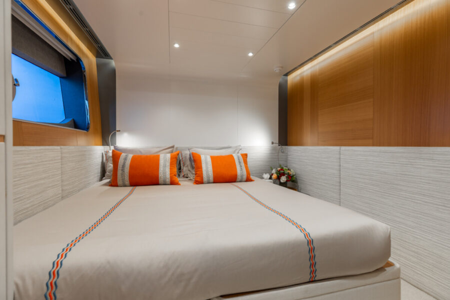 This new build was outfitted with décor, bedding, and tableware to reflect the owners’ request for casual, colorful comfort suited to frequent guests and charter use. Coral and blue tones with sea-inspired patterns add vibrancy, while dark sateen bedding, versatile tableware, and collapsible buffets provide practical functionality.