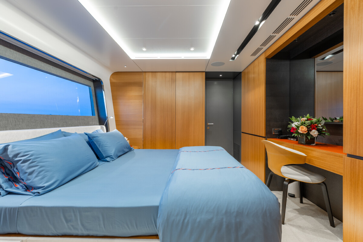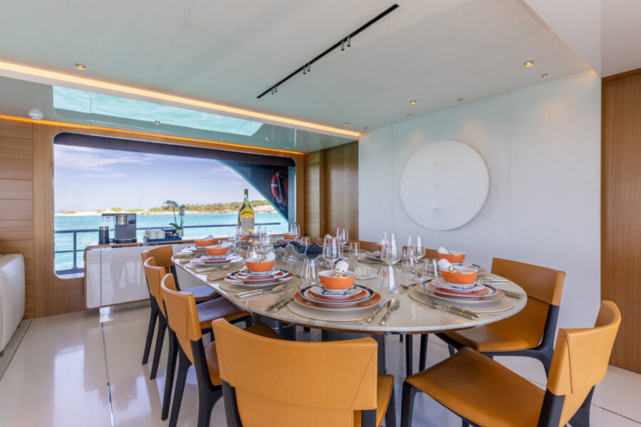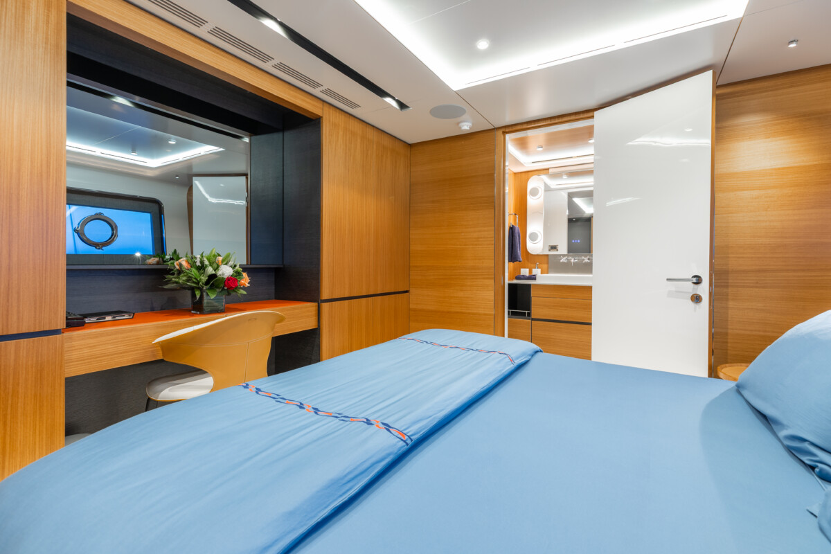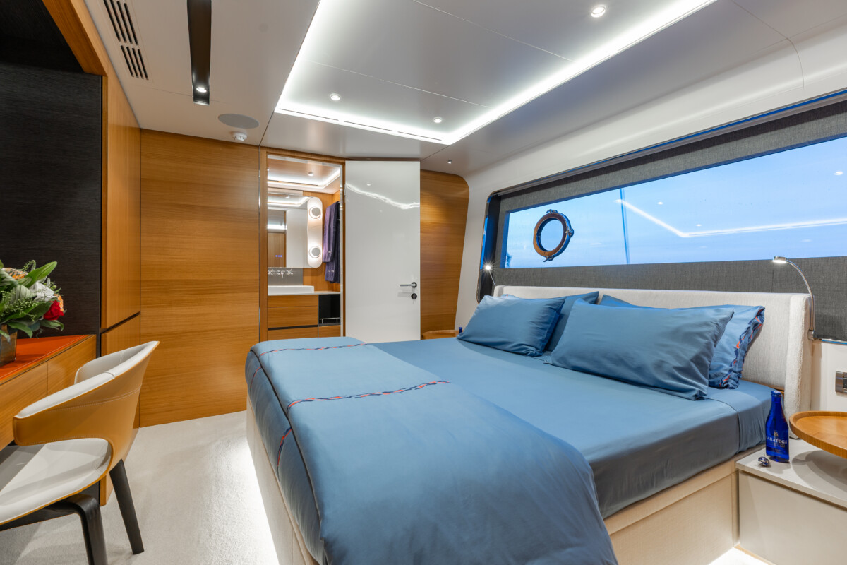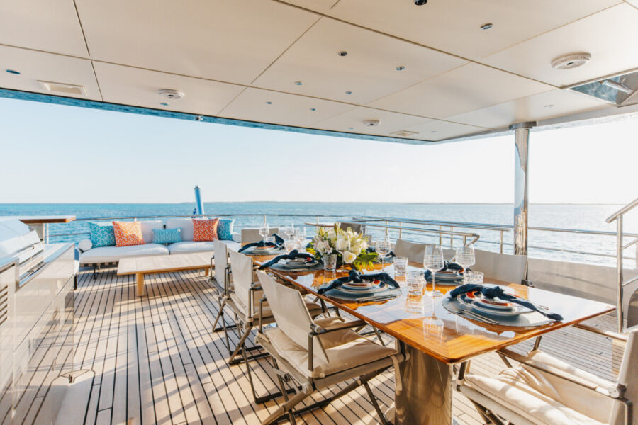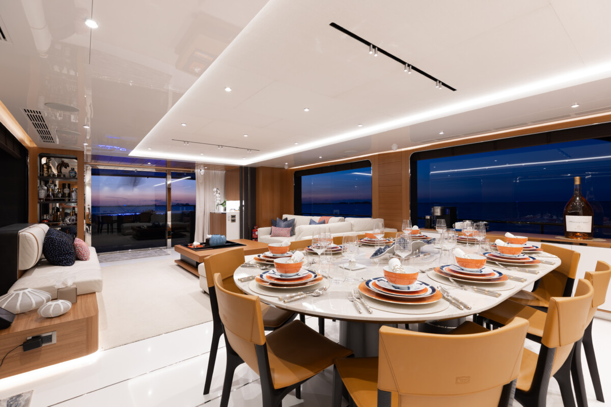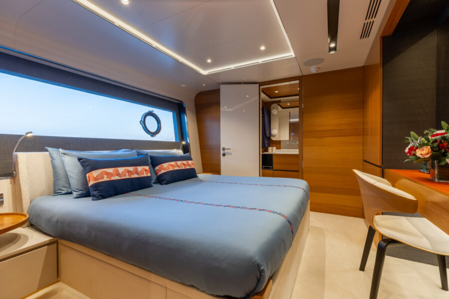 This new build was outfitted with décor, bedding, and tableware to reflect the owners’ request for casual, colorful comfort suited to frequent guests and charter use. Coral and blue tones with sea-inspired patterns add vibrancy, while dark sateen bedding, versatile tableware, and collapsible buffets provide practical functionality.