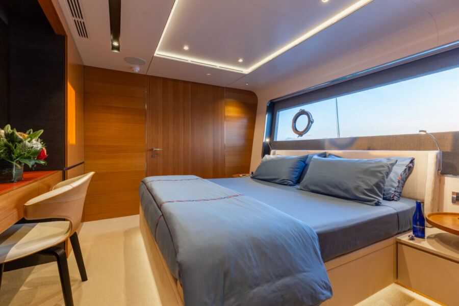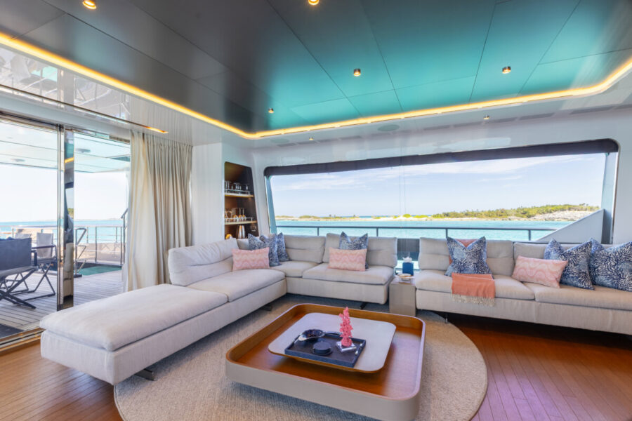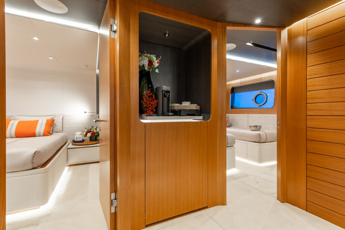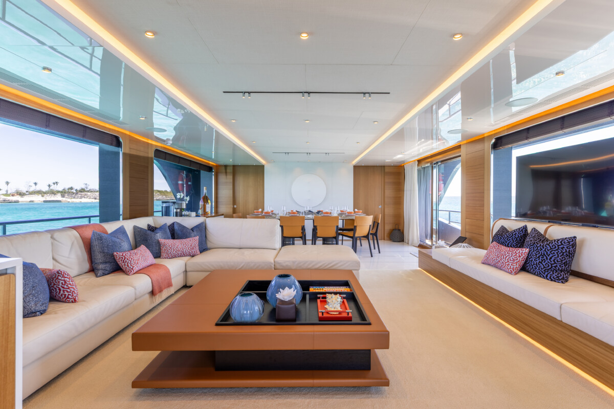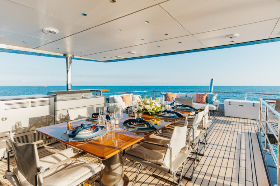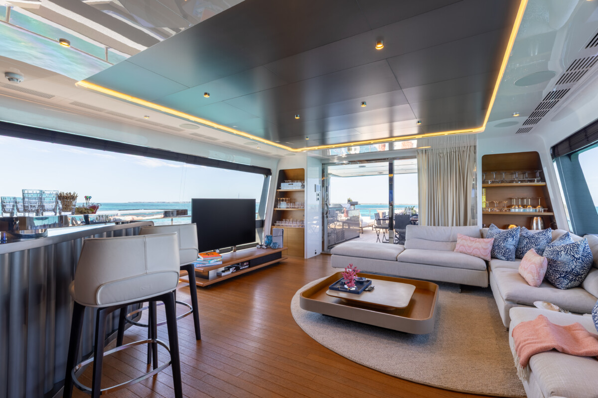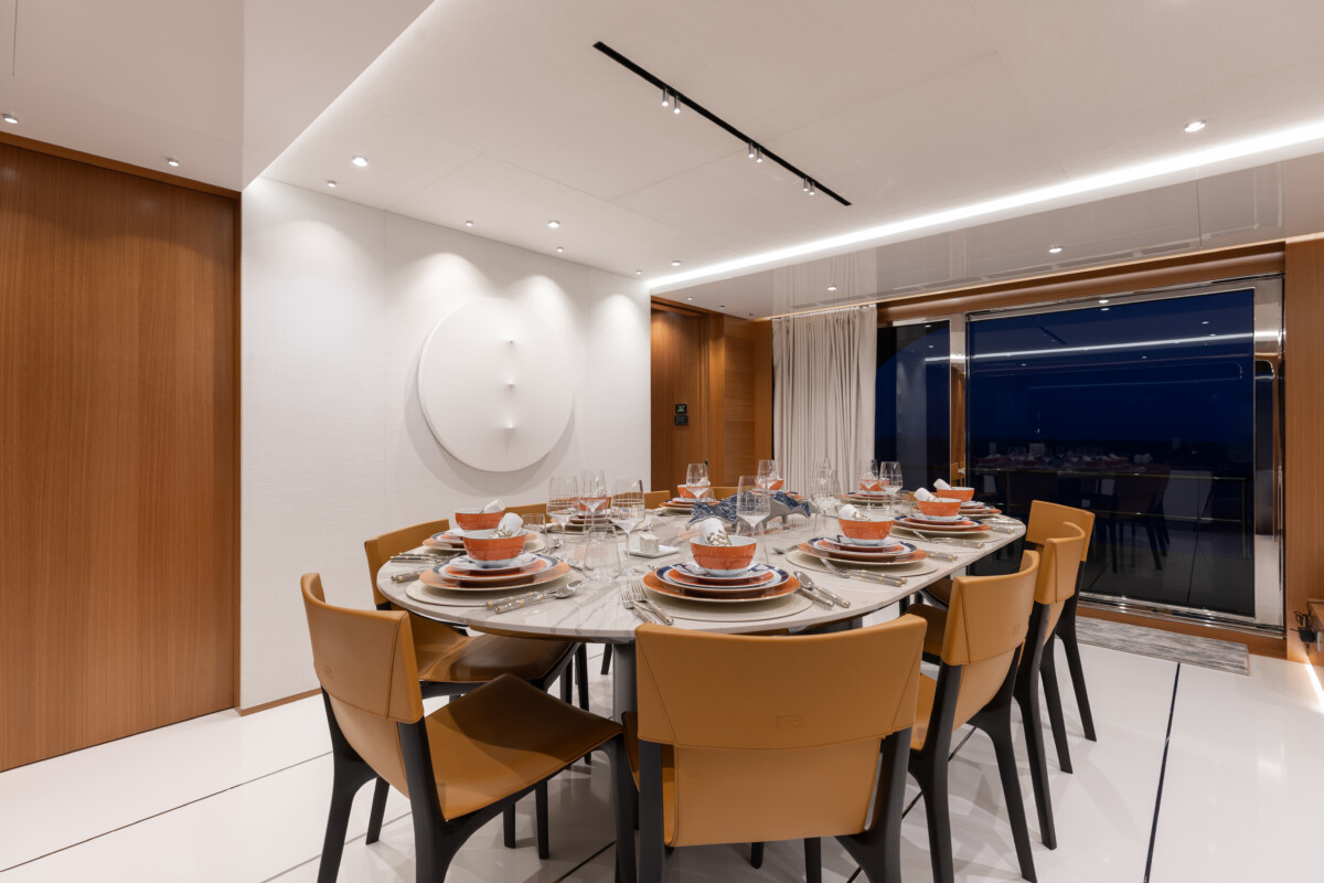 This new build was outfitted with décor, bedding, and tableware to reflect the owners’ request for casual, colorful comfort suited to frequent guests and charter use. Coral and blue tones with sea-inspired patterns add vibrancy, while dark sateen bedding, versatile tableware, and collapsible buffets provide practical functionality.