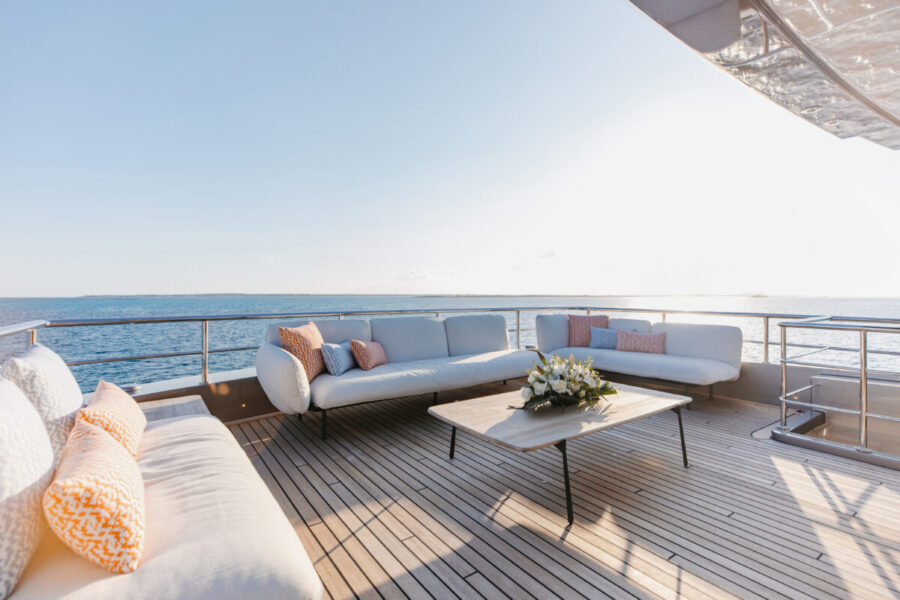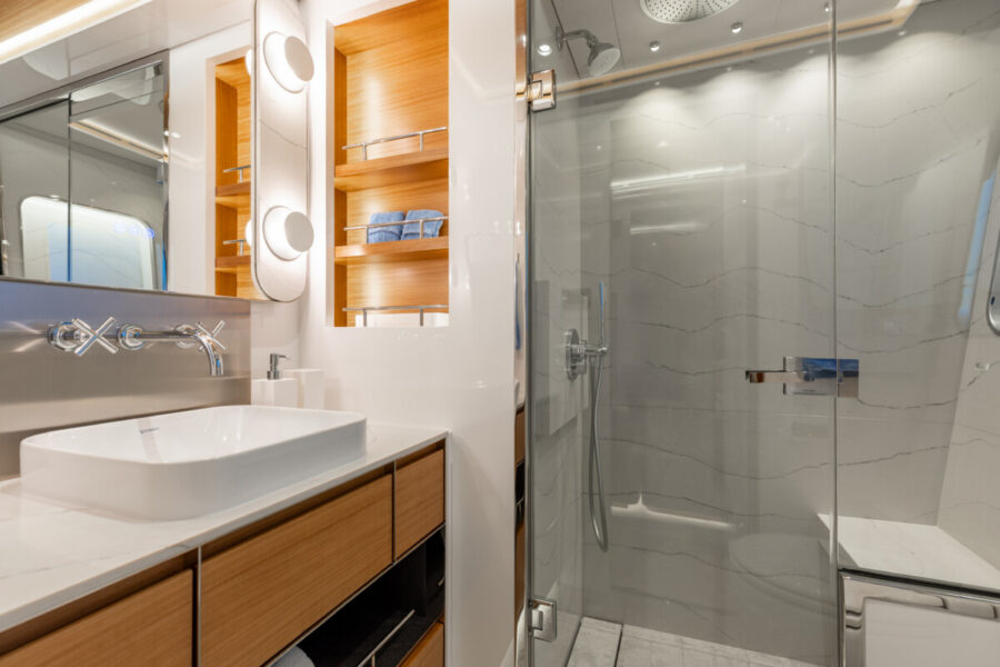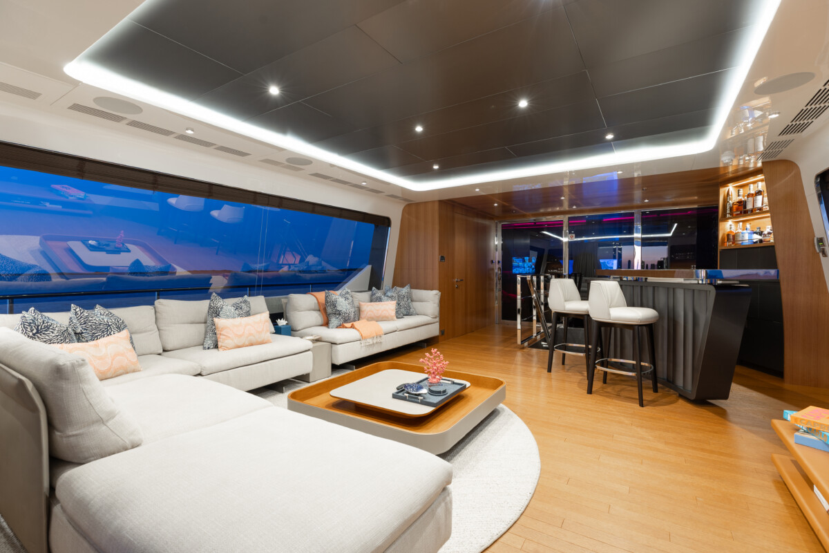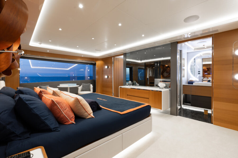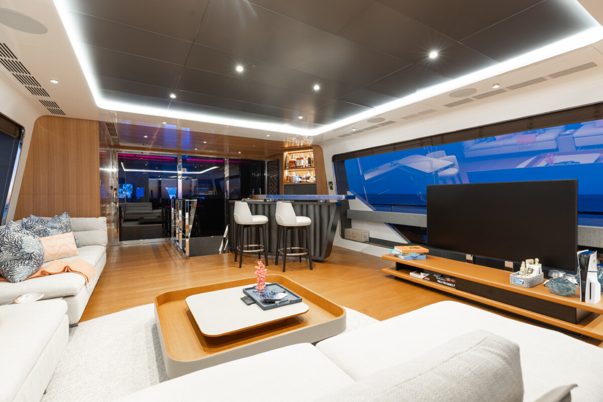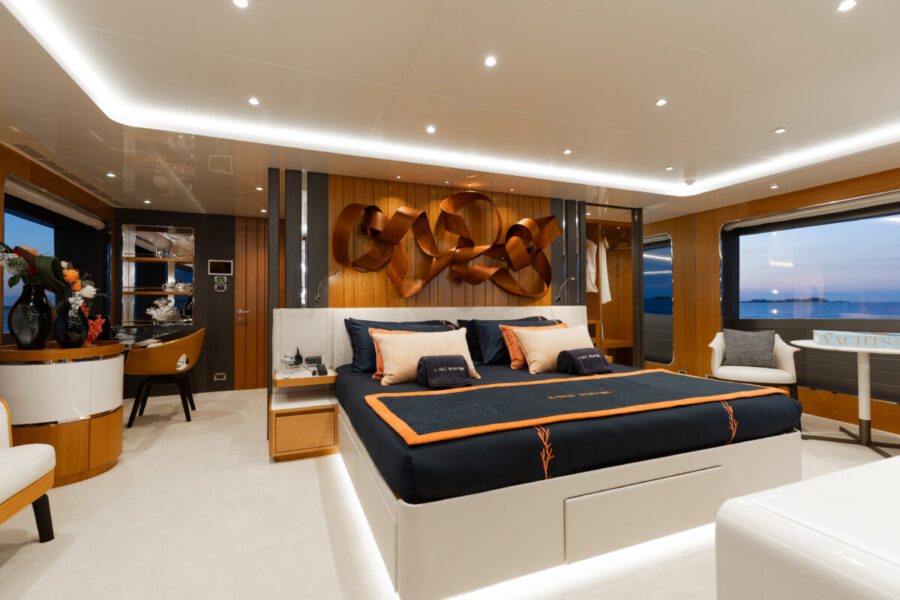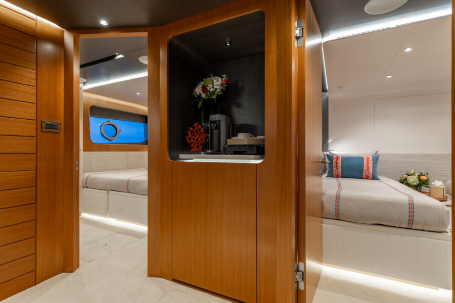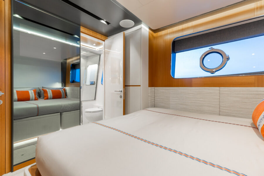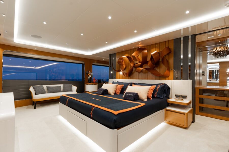 This new build was outfitted with décor, bedding, and tableware to reflect the owners’ request for casual, colorful comfort suited to frequent guests and charter use. Coral and blue tones with sea-inspired patterns add vibrancy, while dark sateen bedding, versatile tableware, and collapsible buffets provide practical functionality.