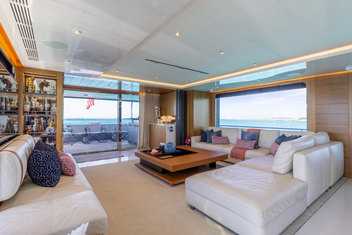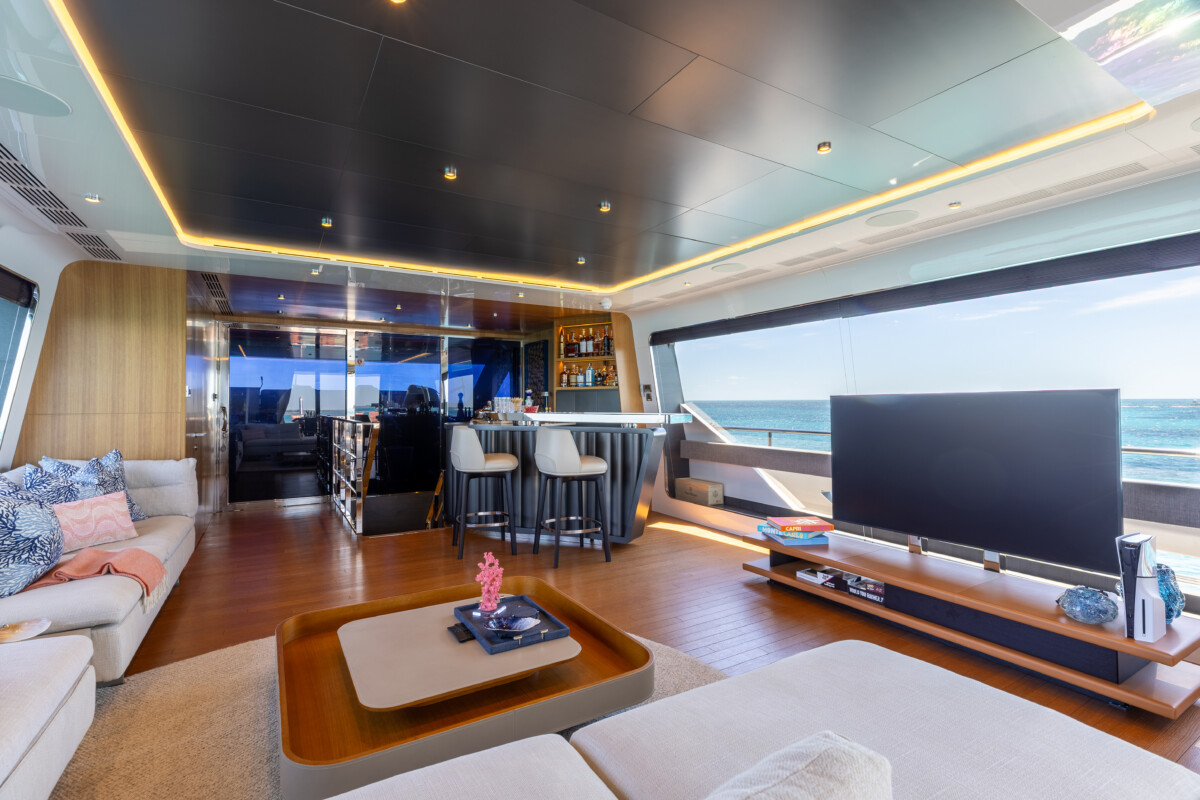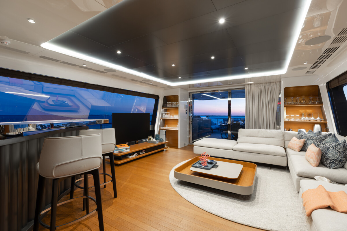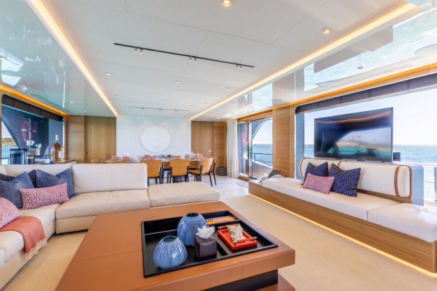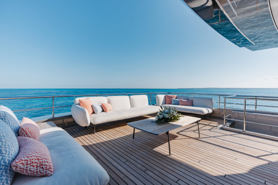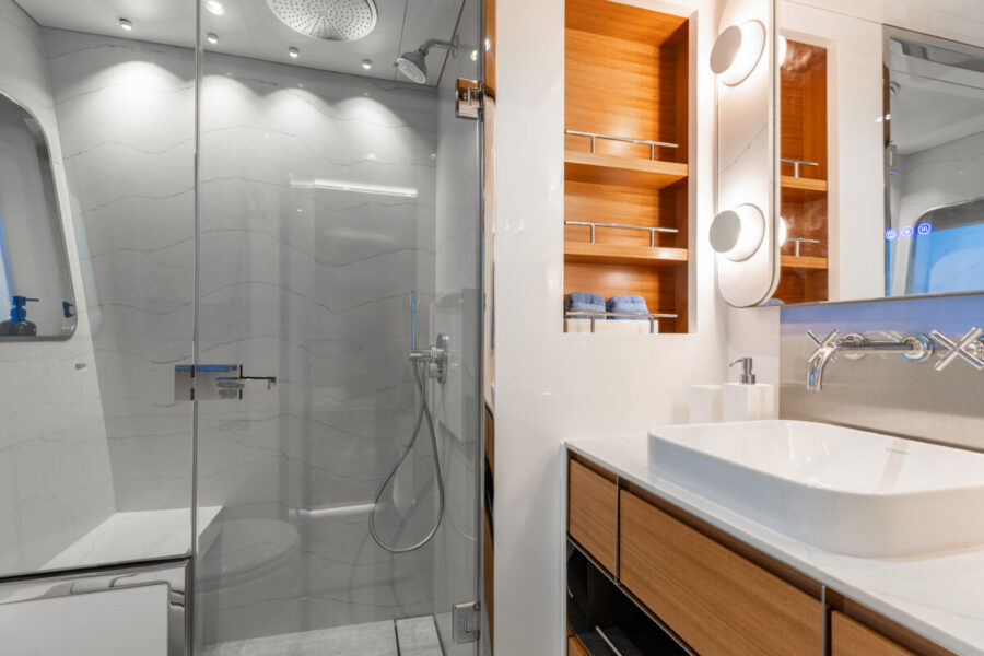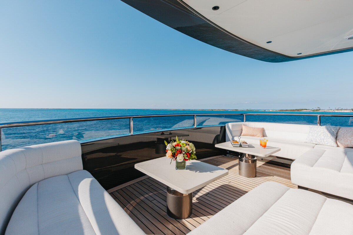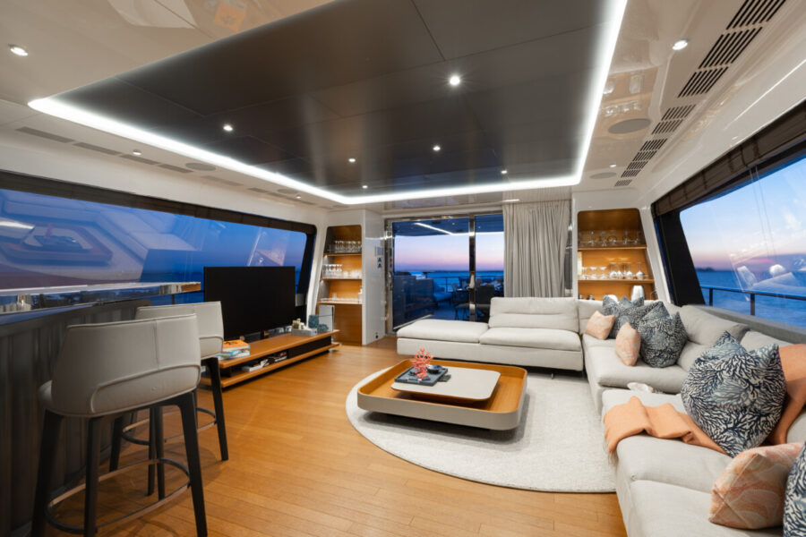 This new build was outfitted with décor, bedding, and tableware to reflect the owners’ request for casual, colorful comfort suited to frequent guests and charter use. Coral and blue tones with sea-inspired patterns add vibrancy, while dark sateen bedding, versatile tableware, and collapsible buffets provide practical functionality.