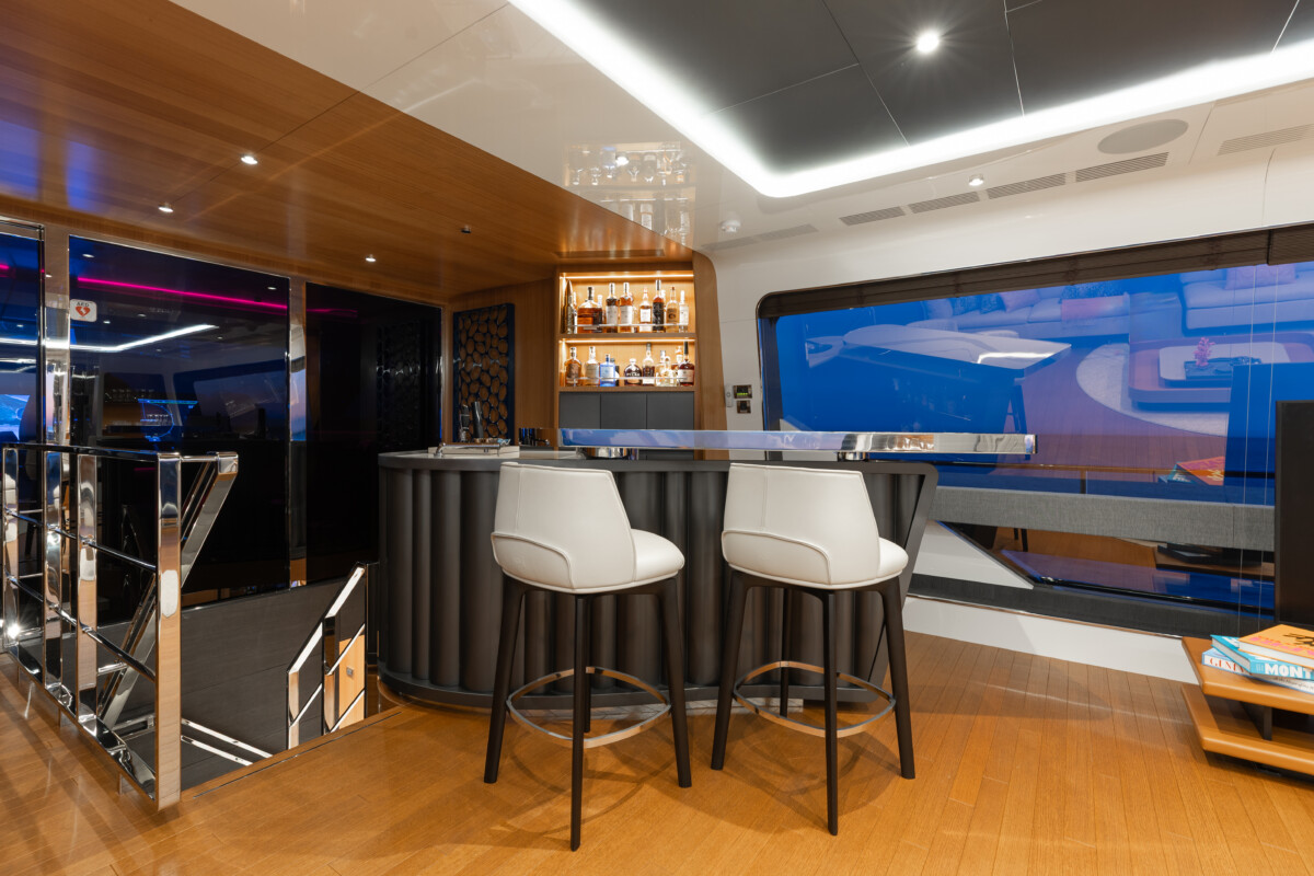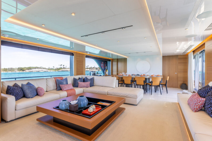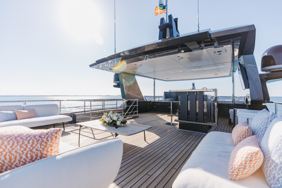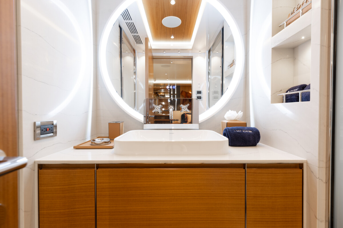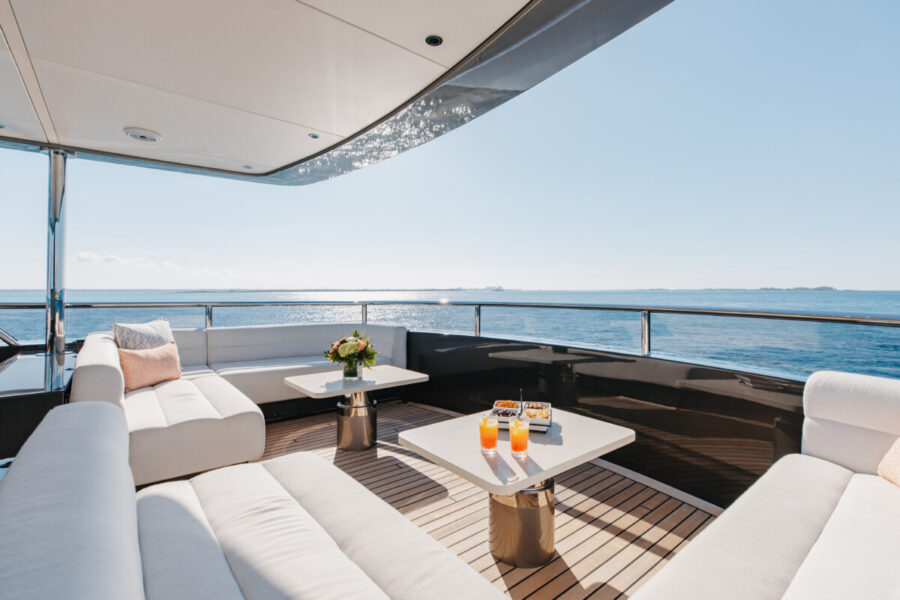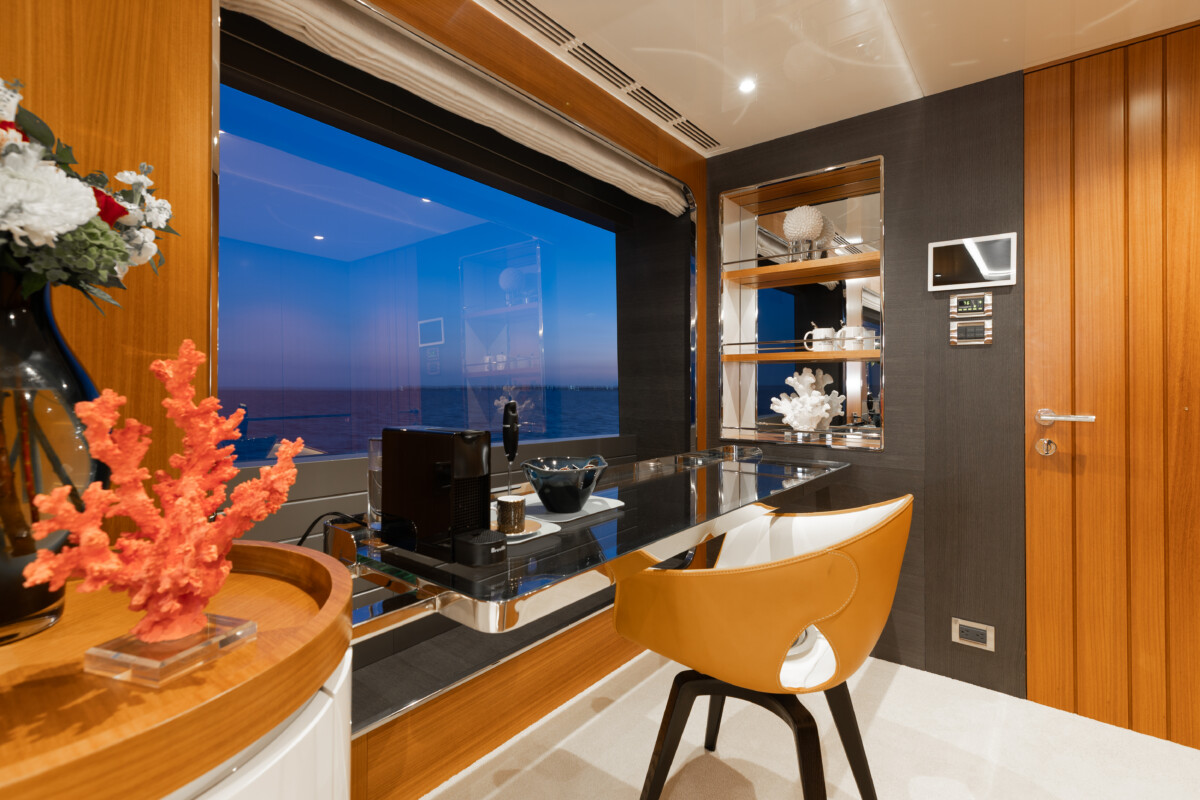 This new build was outfitted with décor, bedding, and tableware to reflect the owners’ request for casual, colorful comfort suited to frequent guests and charter use. Coral and blue tones with sea-inspired patterns add vibrancy, while dark sateen bedding, versatile tableware, and collapsible buffets provide practical functionality.