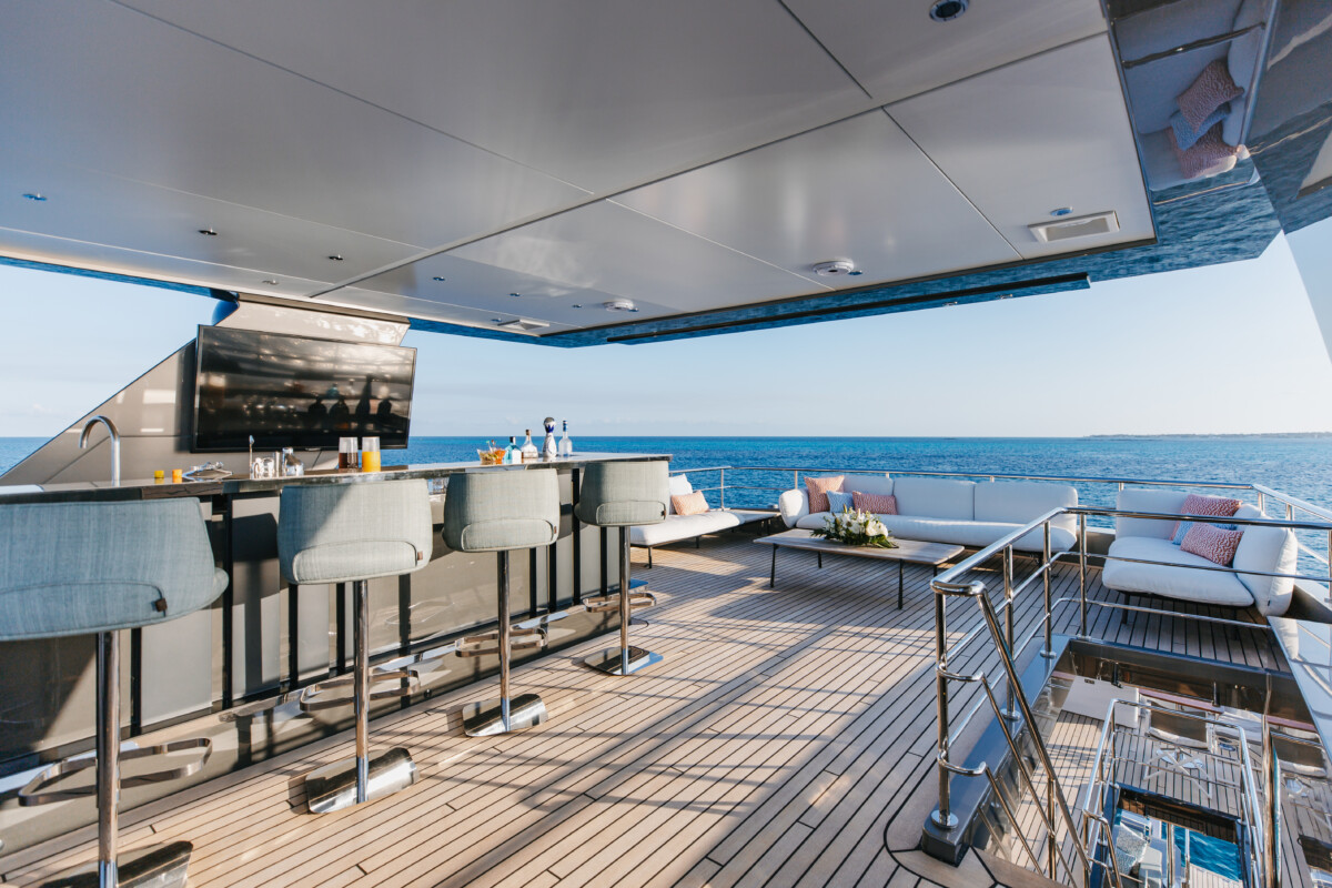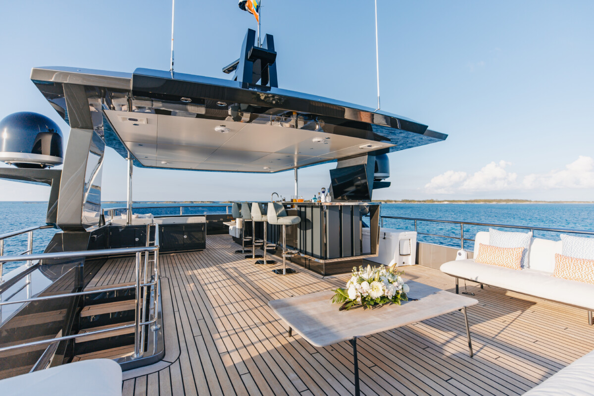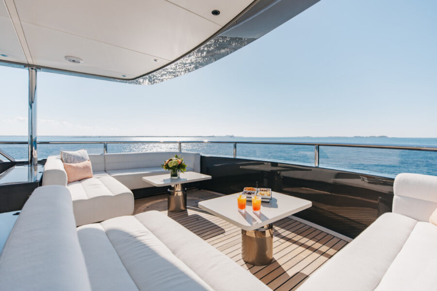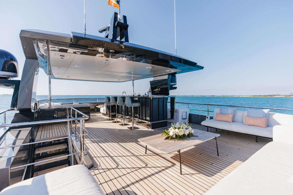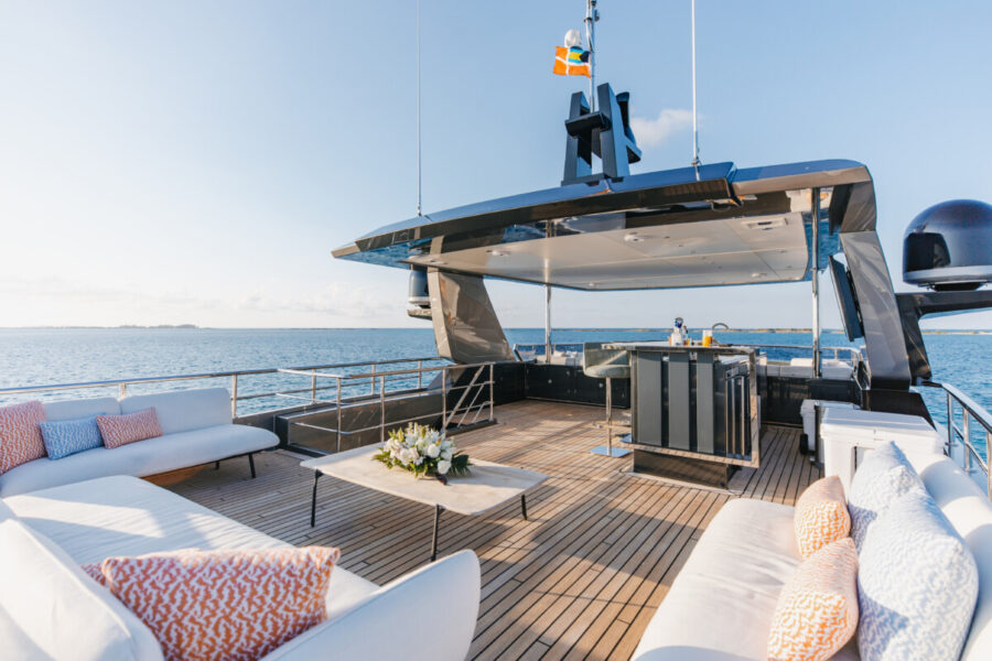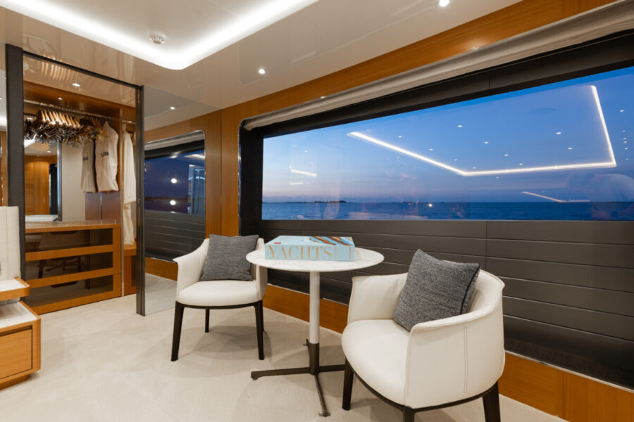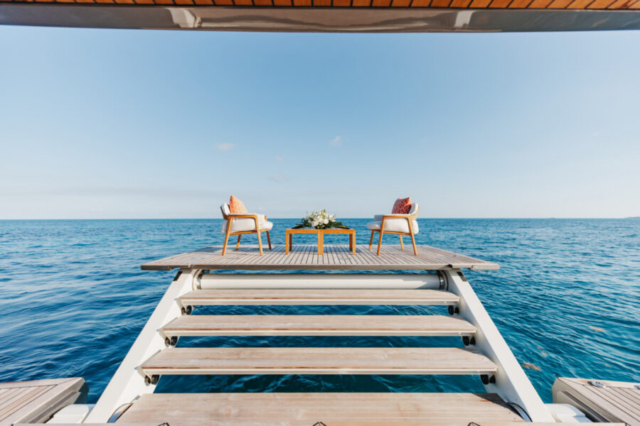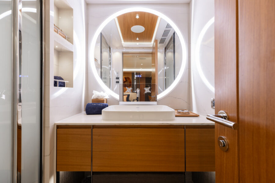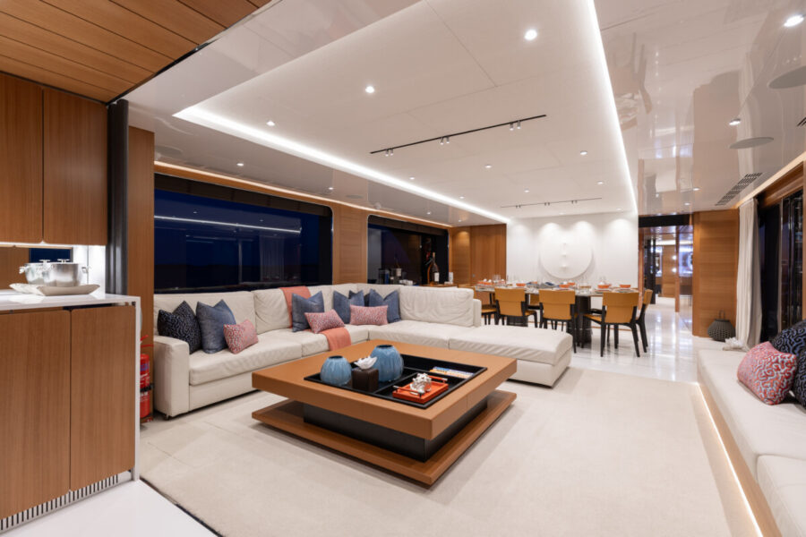 This new build was outfitted with décor, bedding, and tableware to reflect the owners’ request for casual, colorful comfort suited to frequent guests and charter use. Coral and blue tones with sea-inspired patterns add vibrancy, while dark sateen bedding, versatile tableware, and collapsible buffets provide practical functionality.