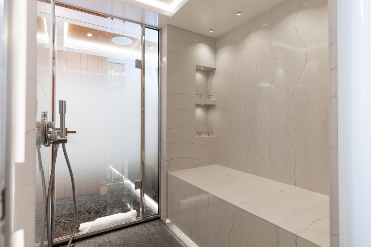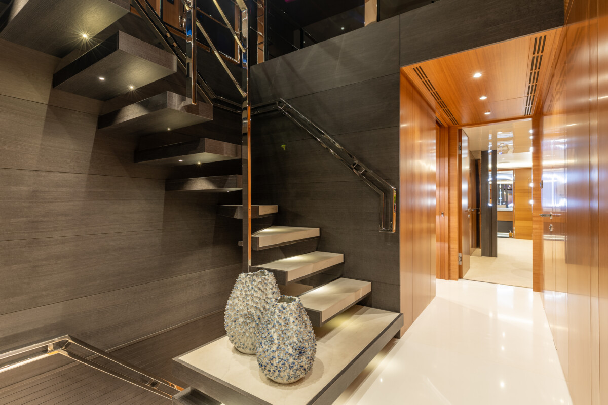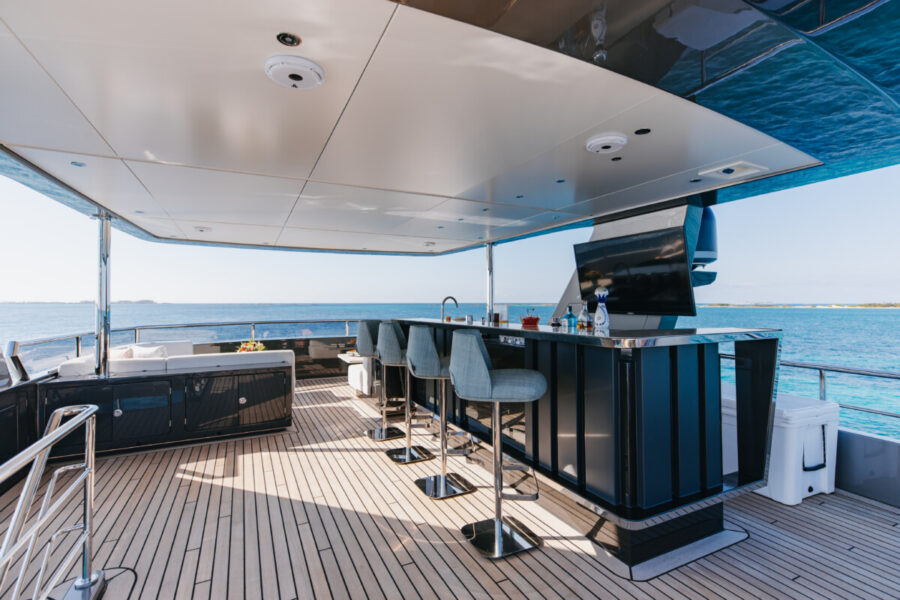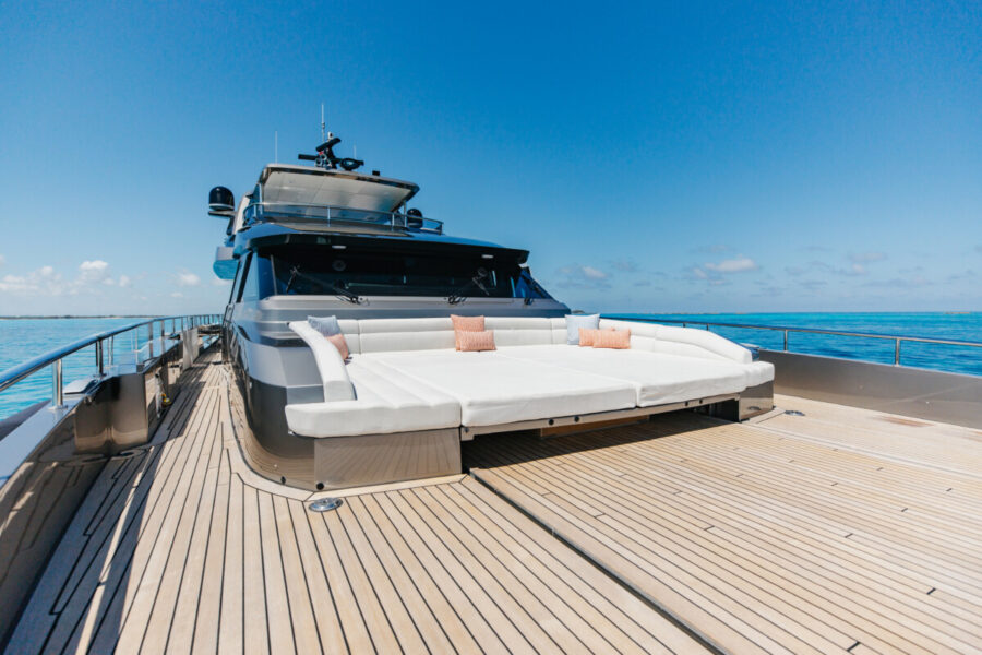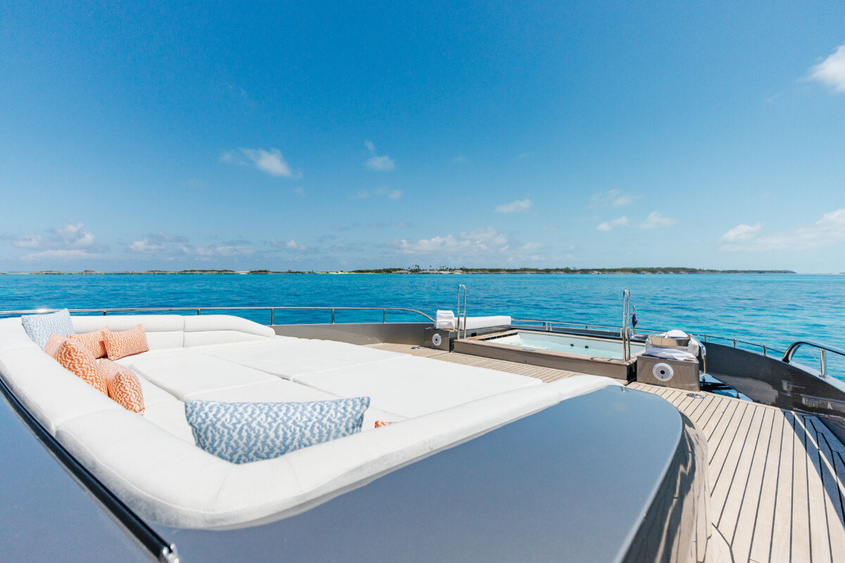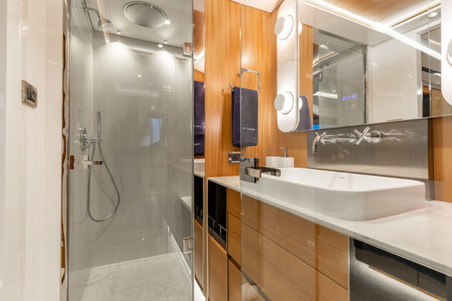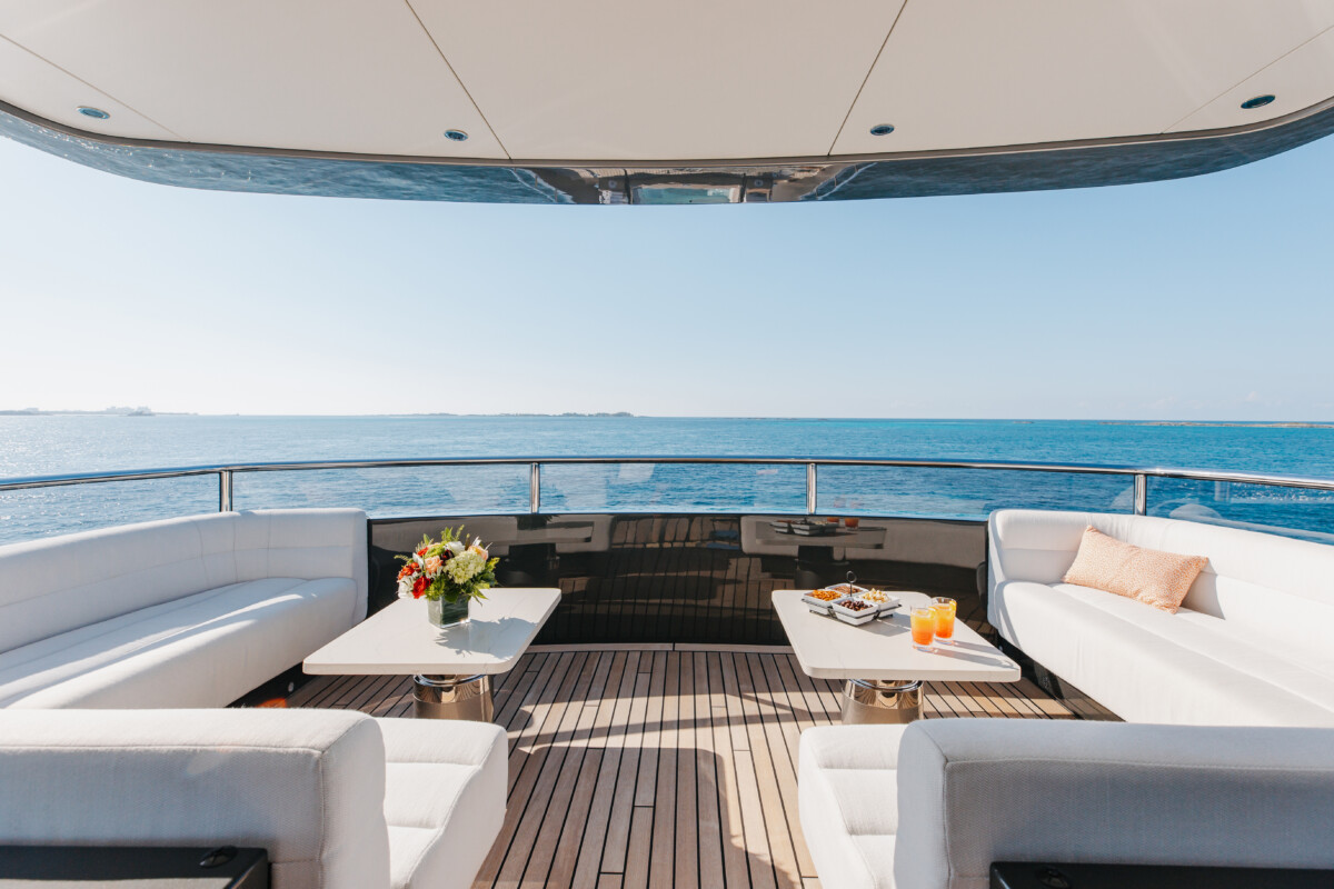 This new build was outfitted with décor, bedding, and tableware to reflect the owners’ request for casual, colorful comfort suited to frequent guests and charter use. Coral and blue tones with sea-inspired patterns add vibrancy, while dark sateen bedding, versatile tableware, and collapsible buffets provide practical functionality.