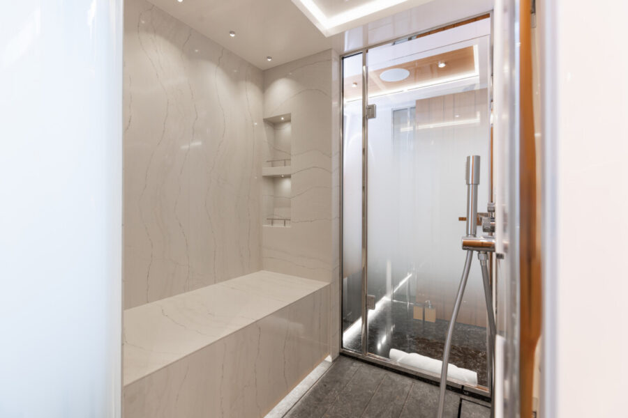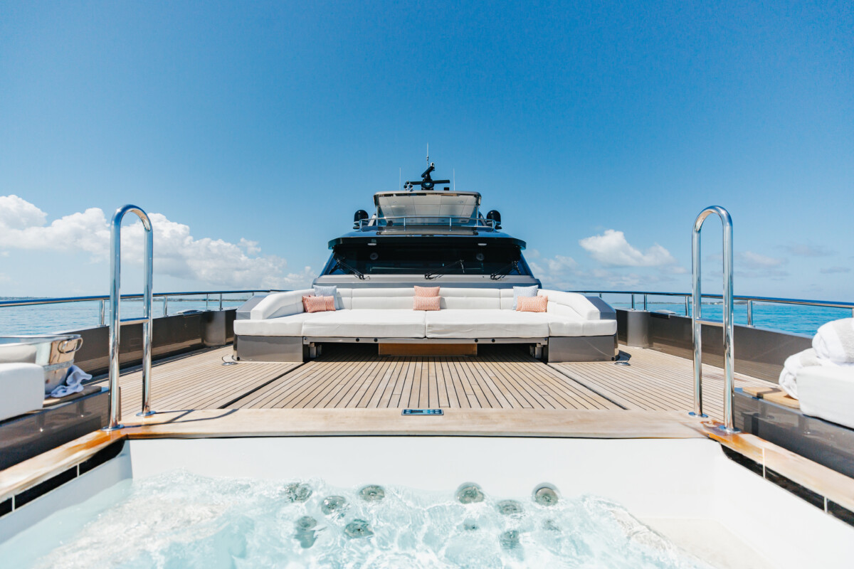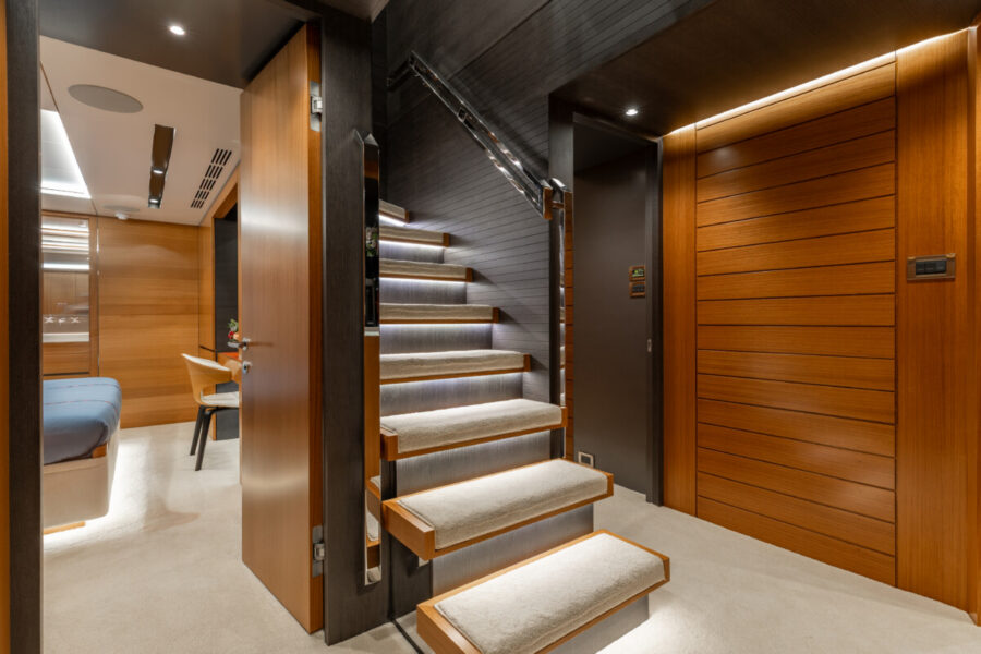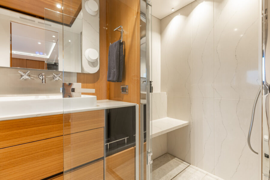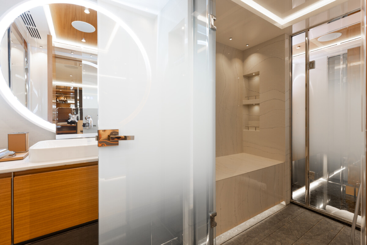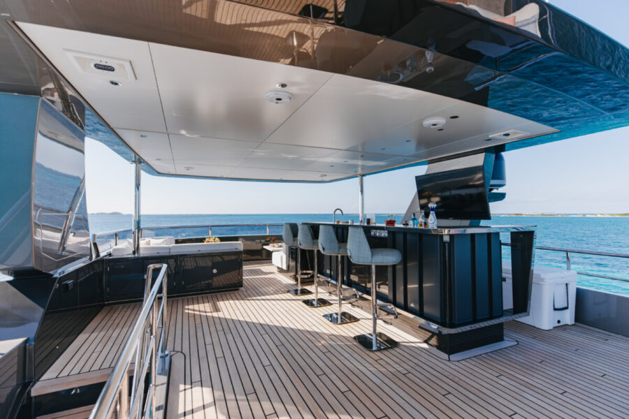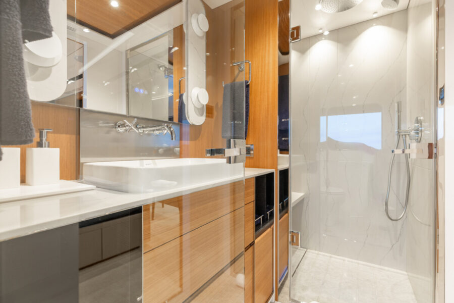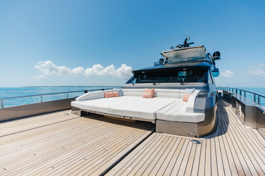 This new build was outfitted with décor, bedding, and tableware to reflect the owners’ request for casual, colorful comfort suited to frequent guests and charter use. Coral and blue tones with sea-inspired patterns add vibrancy, while dark sateen bedding, versatile tableware, and collapsible buffets provide practical functionality.