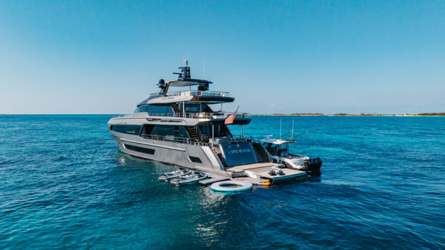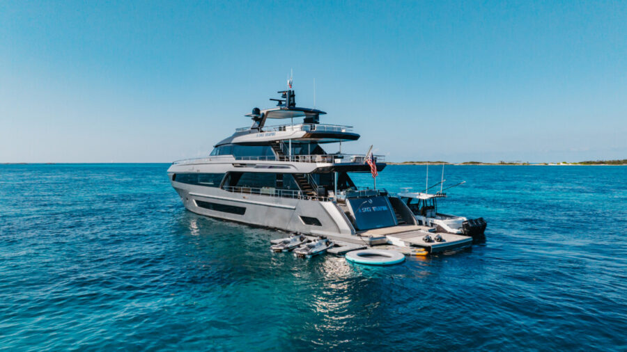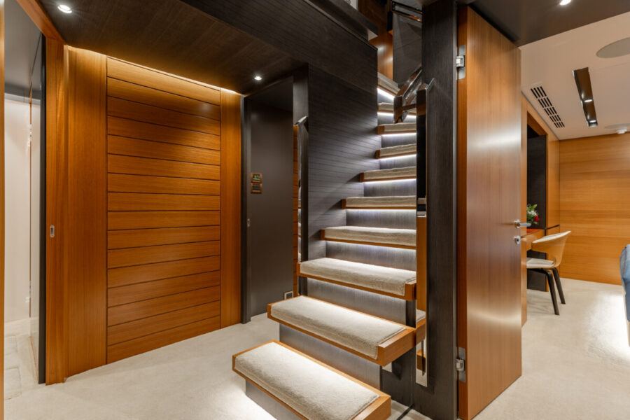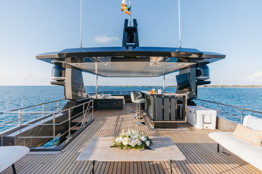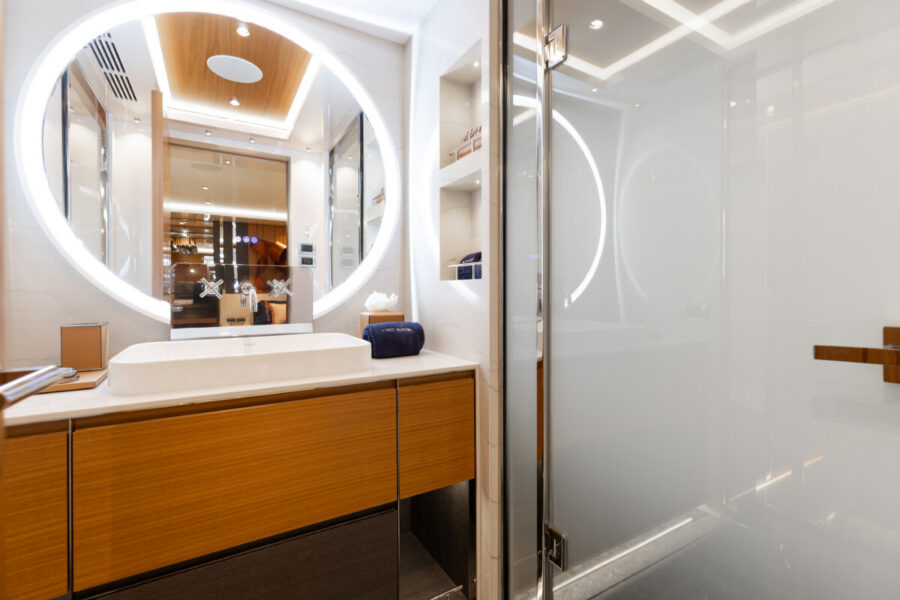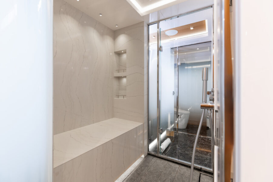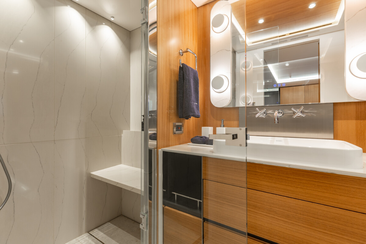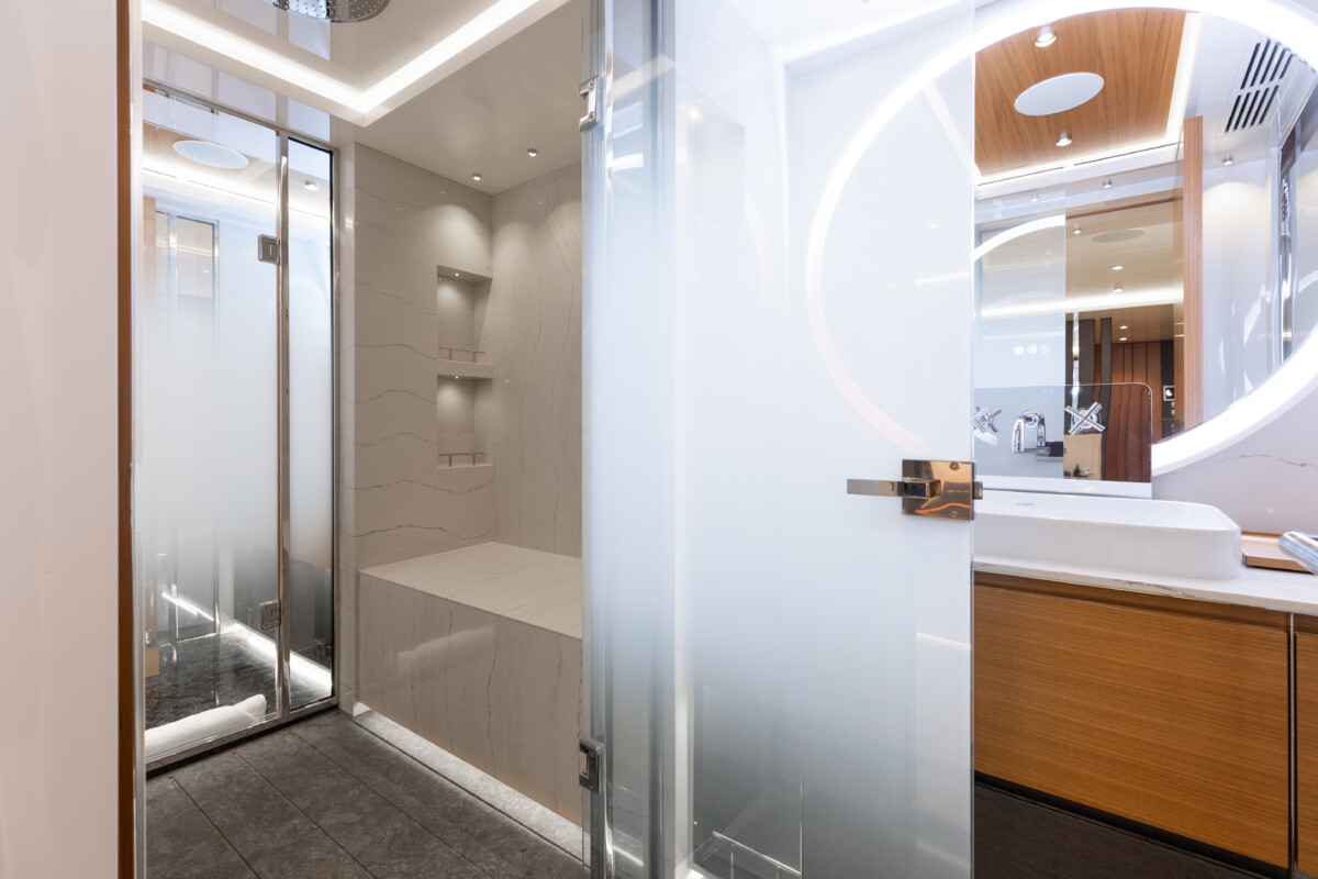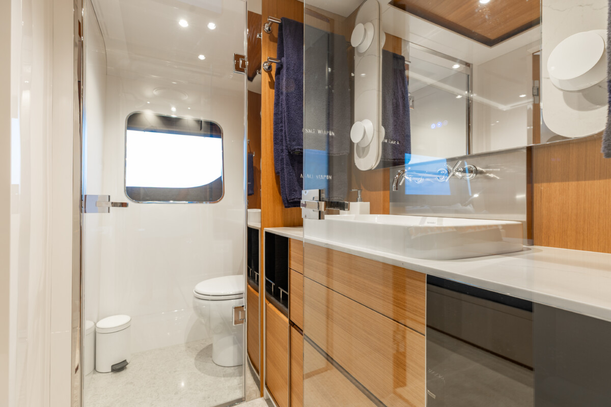 This new build was outfitted with décor, bedding, and tableware to reflect the owners’ request for casual, colorful comfort suited to frequent guests and charter use. Coral and blue tones with sea-inspired patterns add vibrancy, while dark sateen bedding, versatile tableware, and collapsible buffets provide practical functionality.